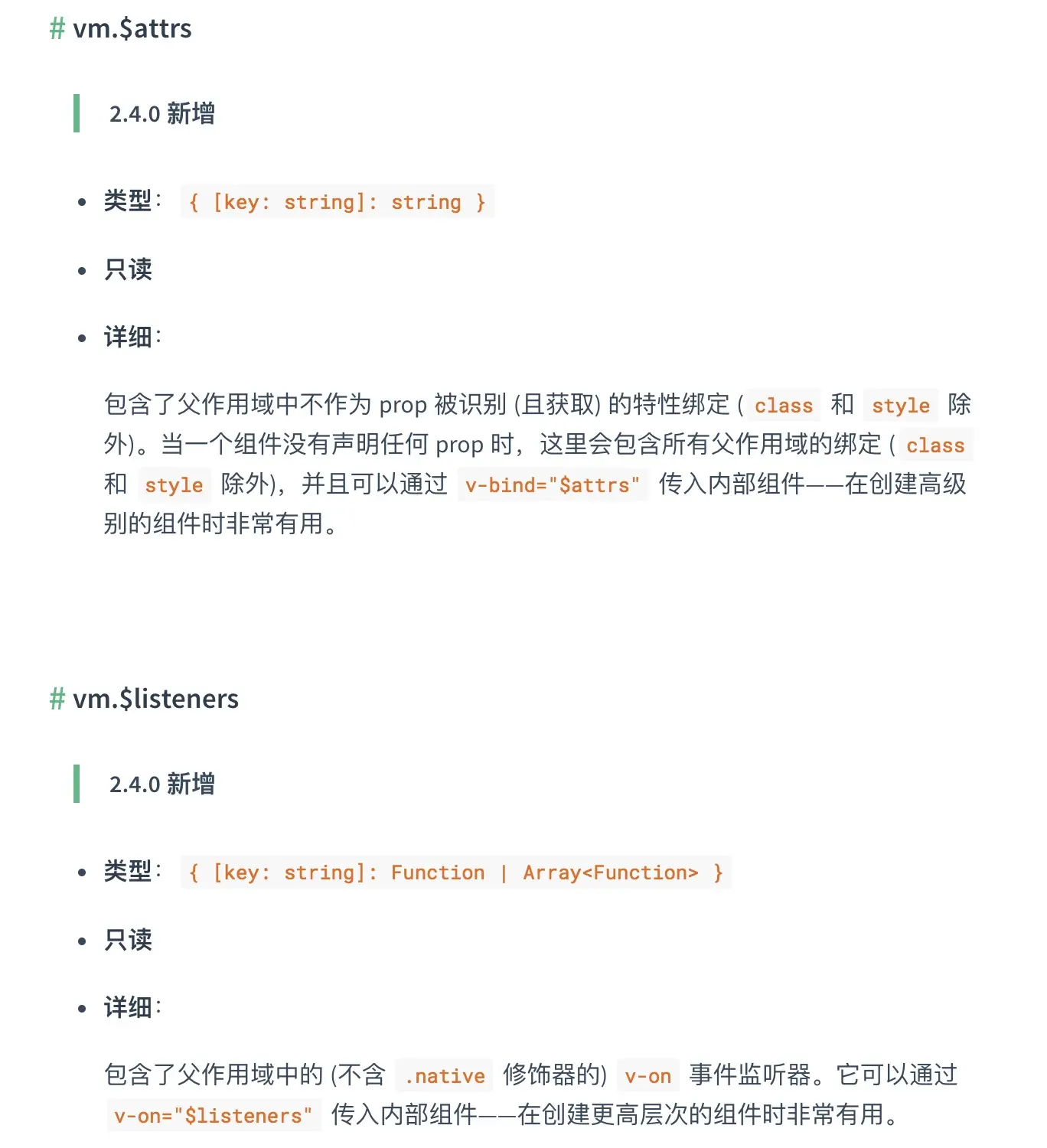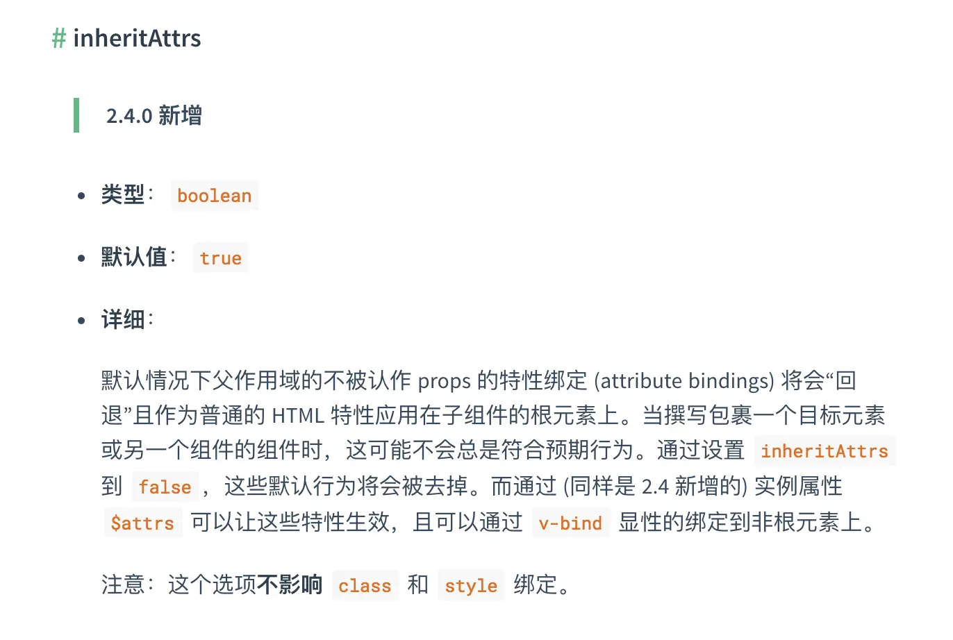 在 Vue2.4 中,为了解决该需求,引入了listeners , 新增了 inheritAttrs 选项。(如下图所示)