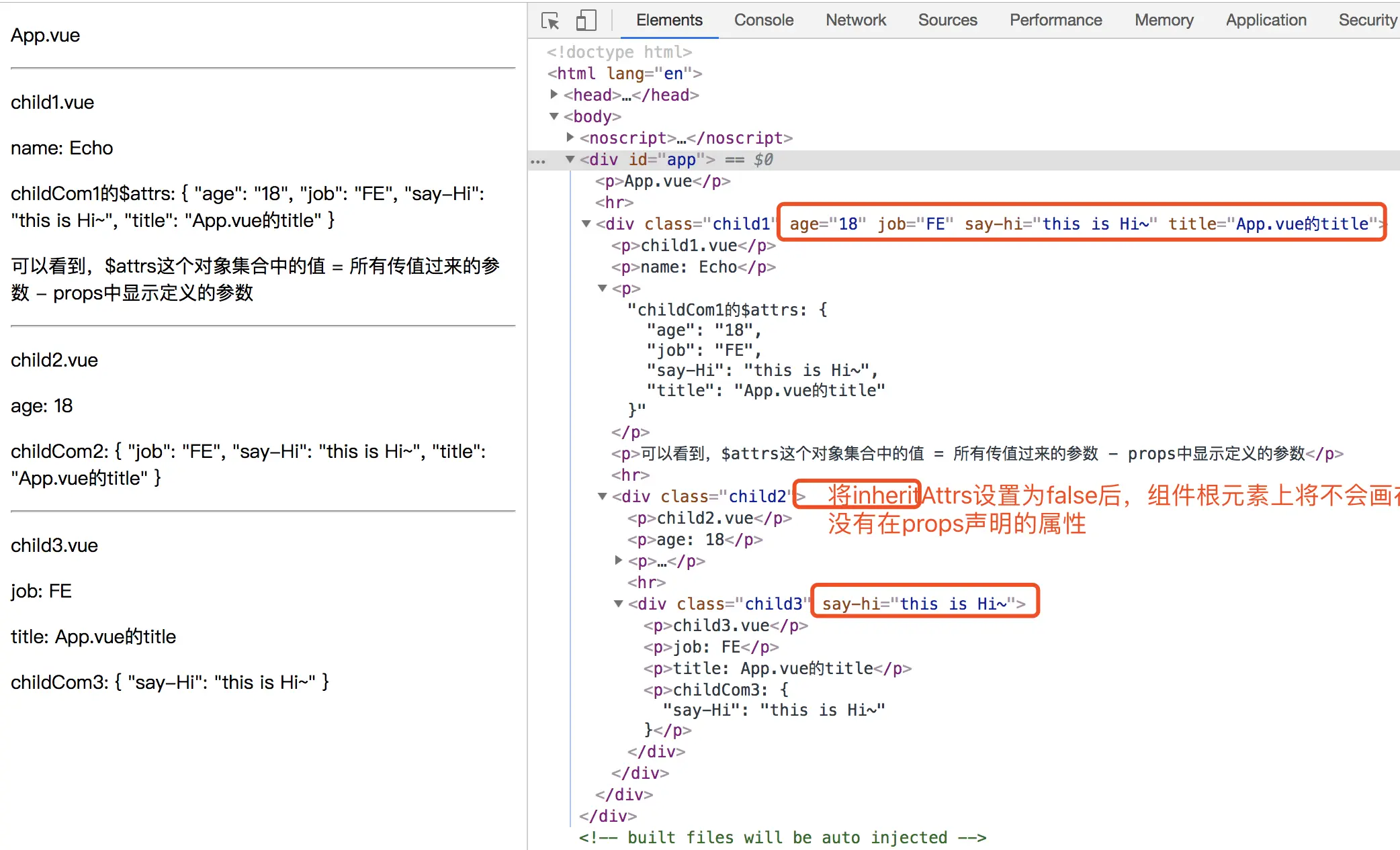 console.log(this.$attrs); // 输出{age: "18", job: "FE", say-Hi: "this is Hi~", title: "App.vue的title"}