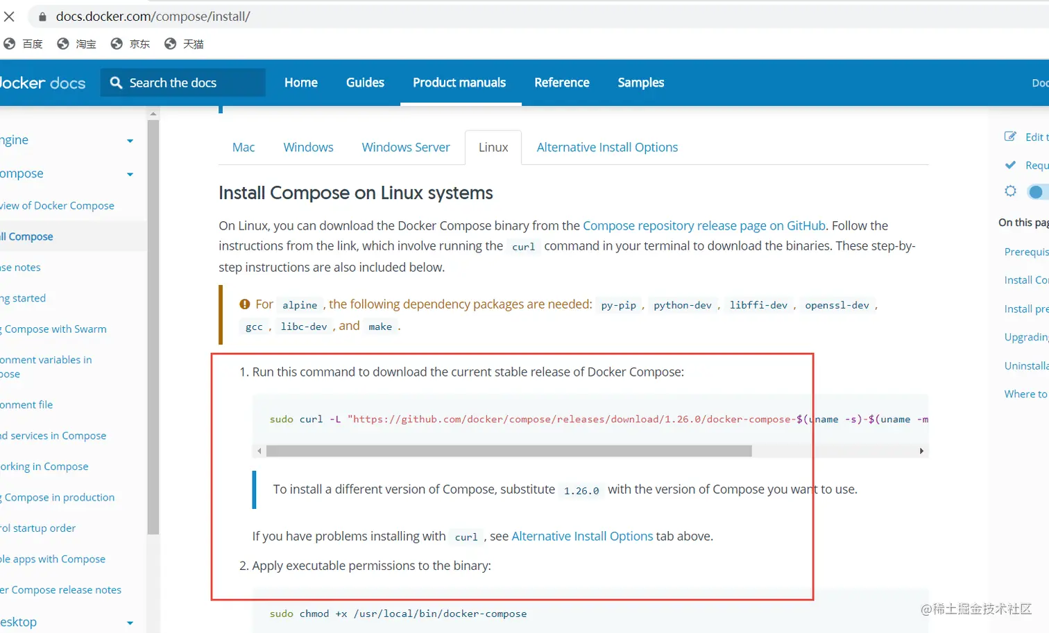开头的准备工作还是那么两样,安装docker和配置镜像加速器,如果还不会的同学可以看下我的《初识docker》,这是预备知识。然后今天我们是用 docker compose 来实现的,所以还需要安装下 docker compose,我们先打开官网看到上面有步骤。