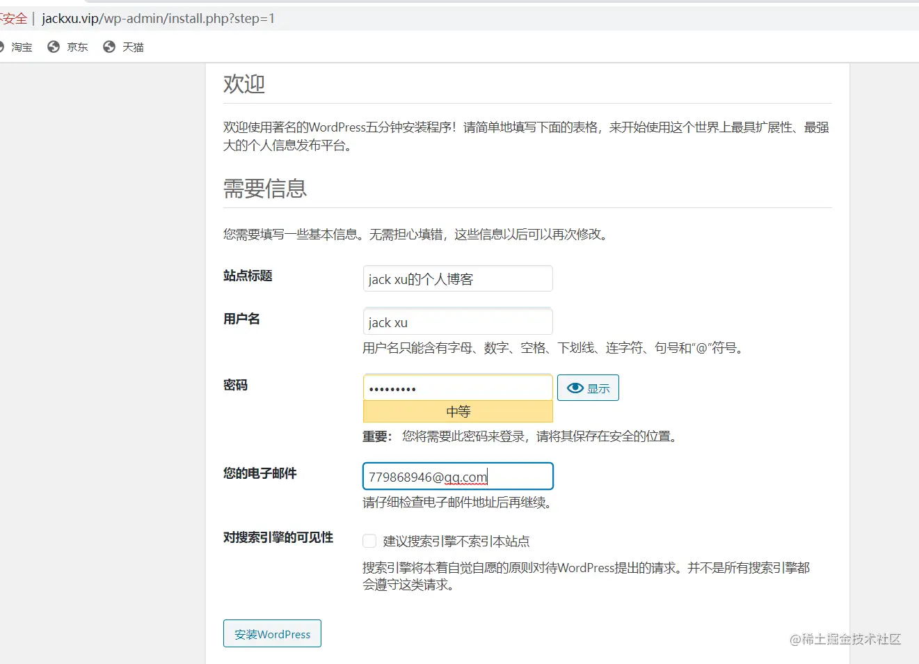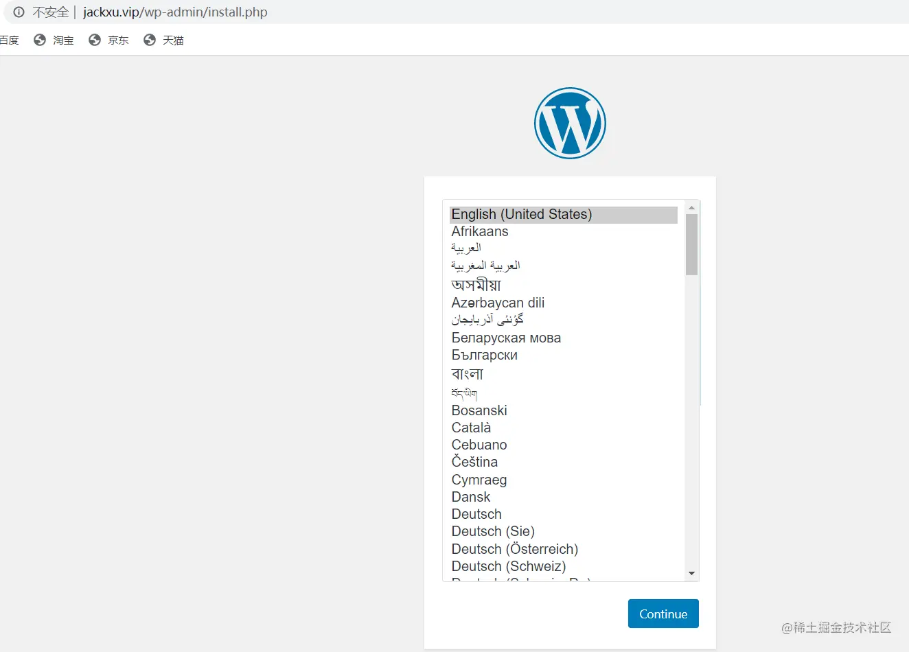 接着我们来访问一下 www.jackxu.vip/wp-admin/in… ,进行博客的语言的选择,网站的账号密码选择,一直点下一步下一步,很简单。