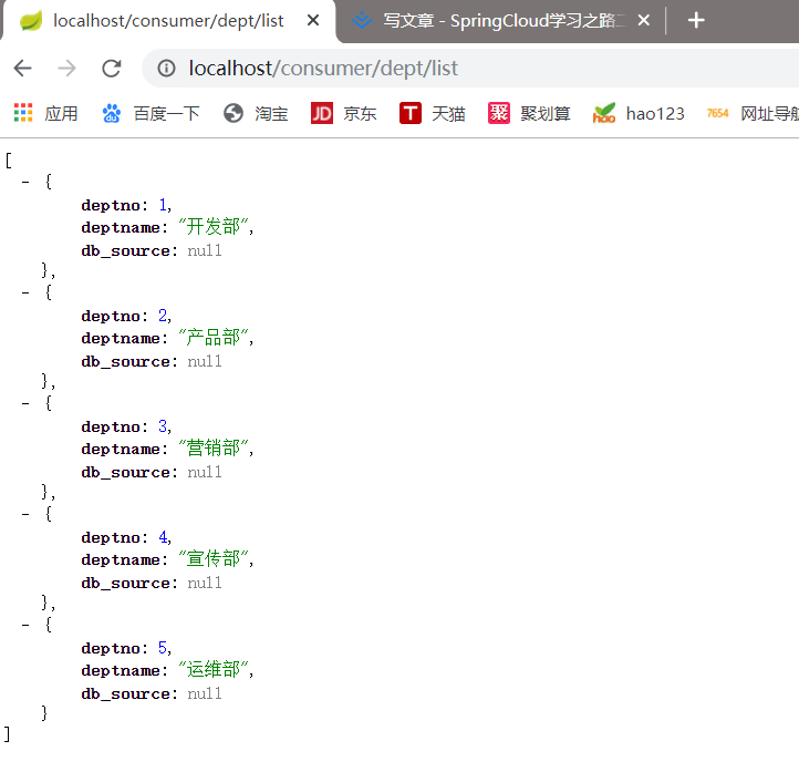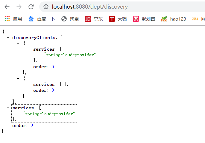 - 3、浏览器测试获取到微服务的数据(输入http://localhost:8080/dept/discovery)