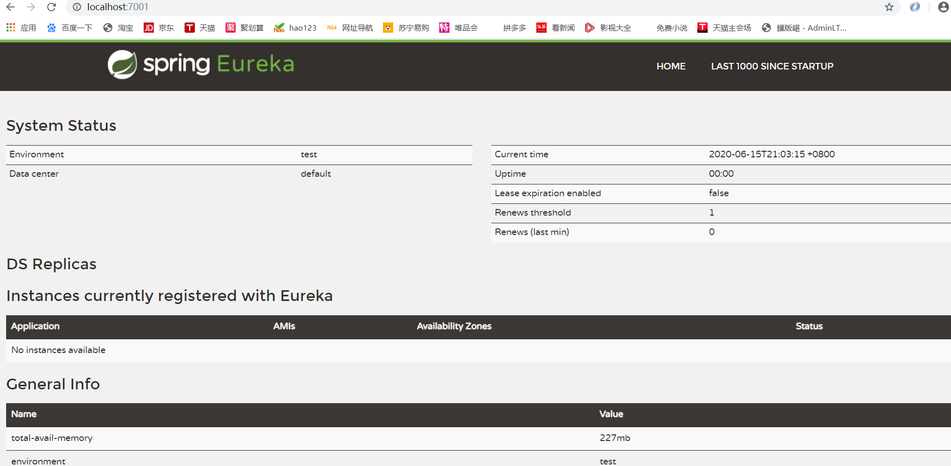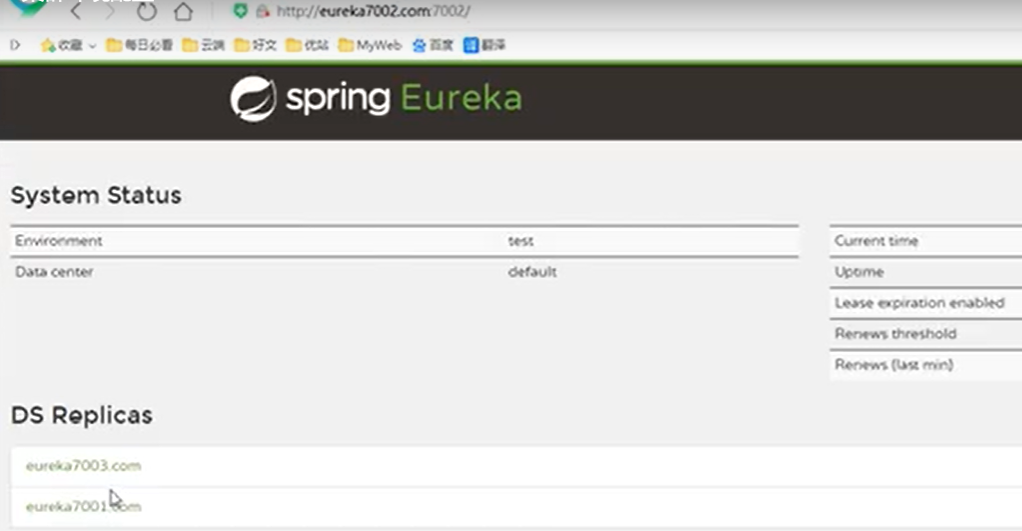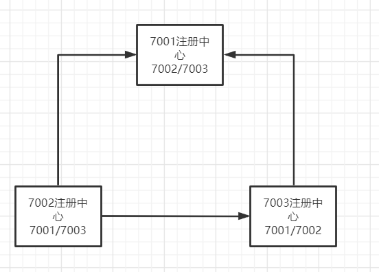- 5、现在我们同时启动三个注册中心(7001、7002、7003),浏览器输入一个注册中心的地址,可以看到另外关联的两个注册中心也出现了