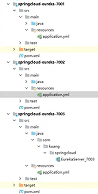 - 1、和上述创建springcloud-eureka-7001子服务(端口号为7001)方式一样再创建两个子服务,也是分为三步: