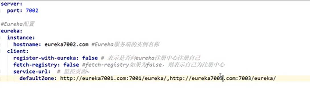 - 3、让每个注册中心去挂载别的注册中心,注册中心相互关联,每个eureka配置相互关联另外两个注册中心的默认url地址。