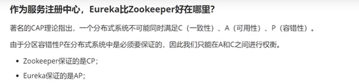 - 那么问题来了,Zookeeper和Eureka同样都是服务注册中心,那么Eureka比Zookeeper好在哪里呢?