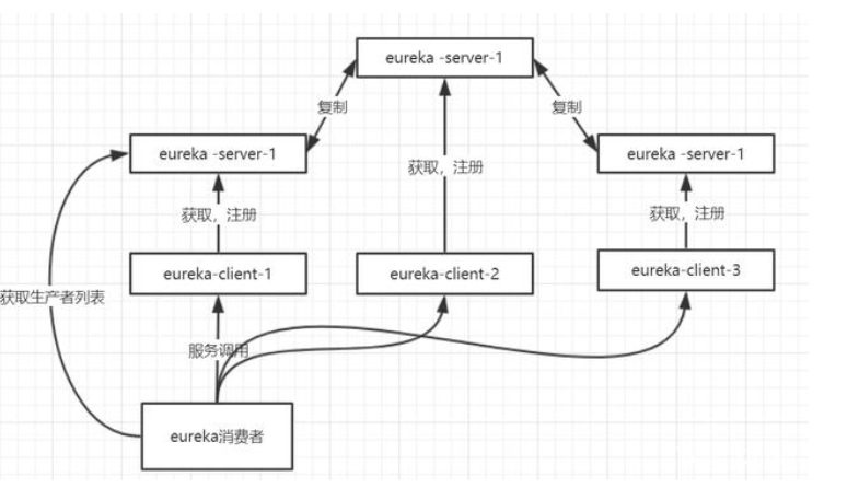 - 3、消费者向Eureka Server中的任一节点获取数据。(事实上,Eureka架构中,并没有严格区分生产者、消费者,二者通常是一体的)