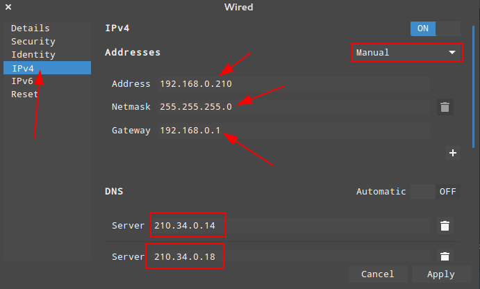 点击「IPv4」,Address 选项设置为「Manual」手动模式,其他配置如下: