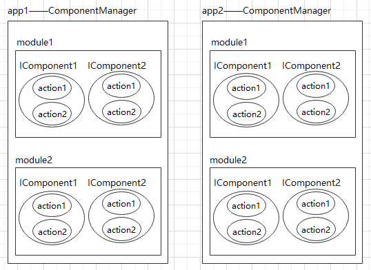 每个app都有多个module,每个module都有多个IComponent,每个IComponent可以处理多个action,所有的IComponent都会在编译时自动注册到应用的ComponentManager单例中进行统一管理,所有的组件调用都是通过这个管理类进行。