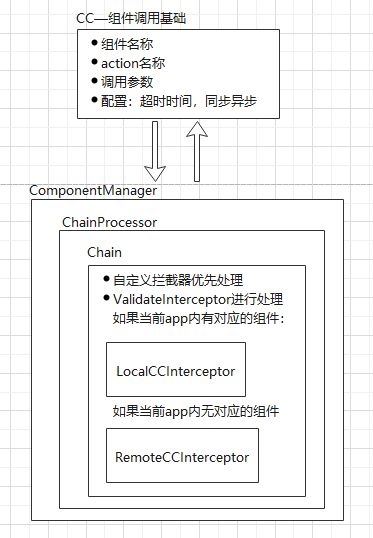 ComponentManager是组件的注册管理器,也是组件调用的处理者,所有的组件调用都在ComponentManager中统一处理。具体的处理逻辑由ChainProcessor和Chain来进行处理。主要的过程就是拦截器的处理,先执行自定义的拦截器,再执行CC内置的拦截器。