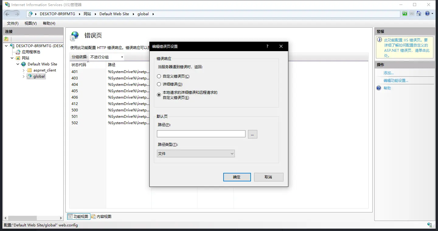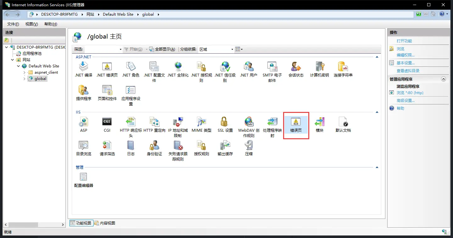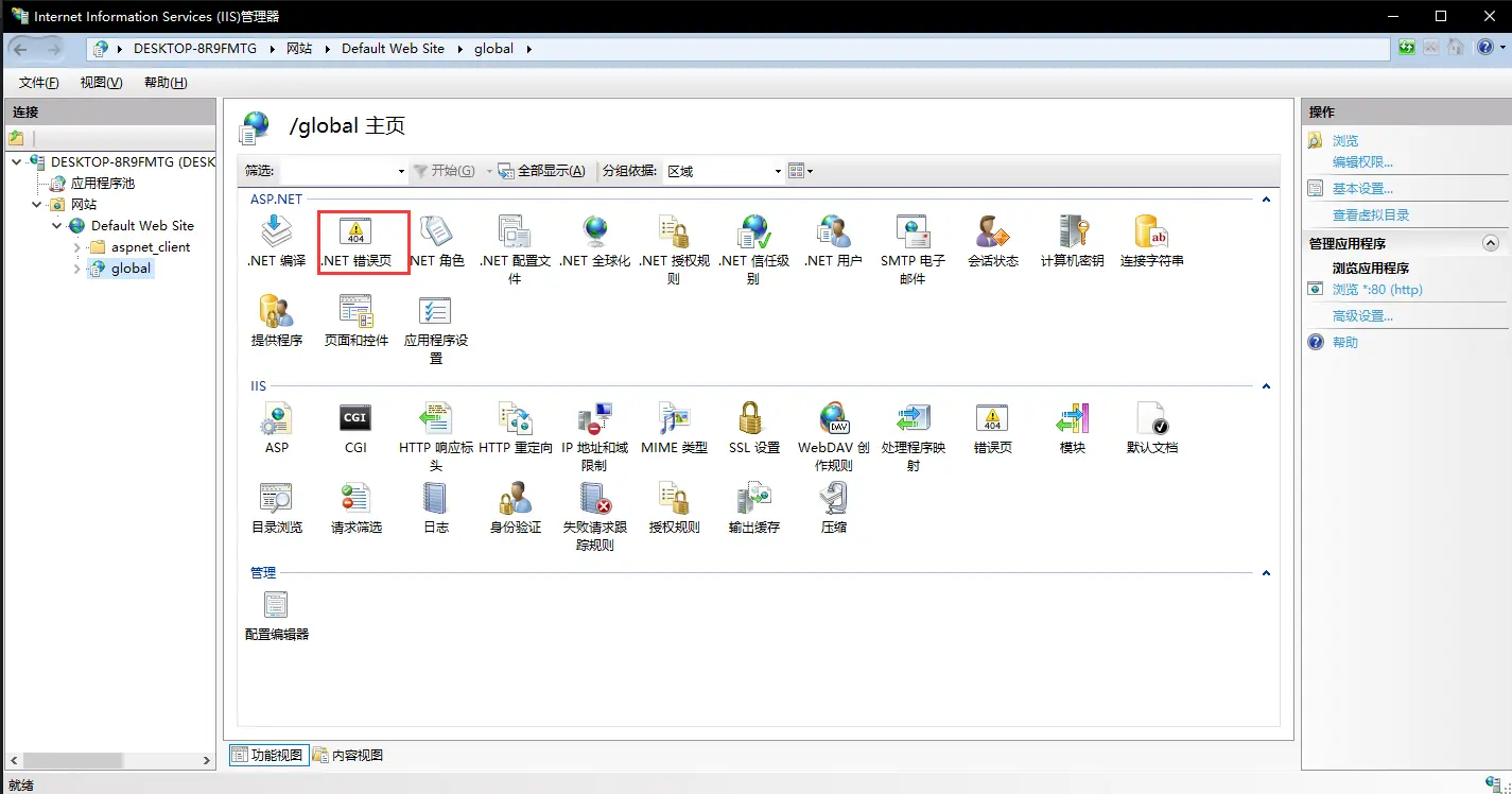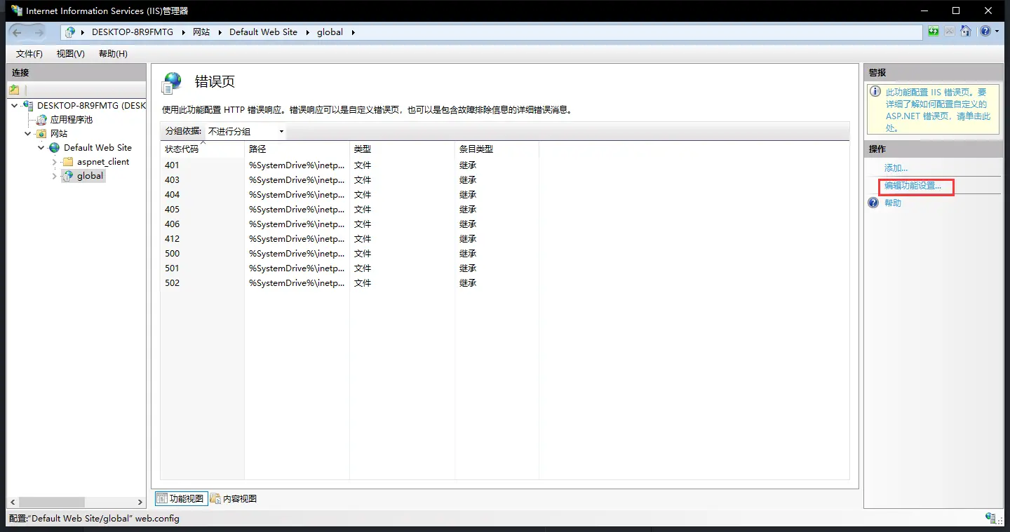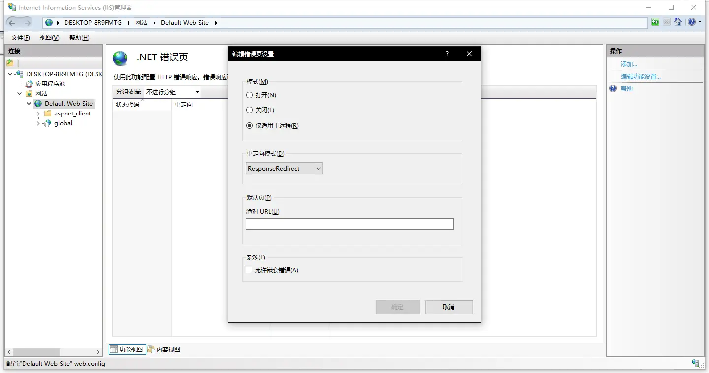 刚开始不想改程序代码,所以直接就想到了IIS里面的错误页配置配置,一开始反复测试,设置改了很多,但是没有效果,后来发现是静态页的配置,还没有进入MVC的程序部分,所以对于.NET MVC这种动态页是不生效的,应该使用.NET错误页选项