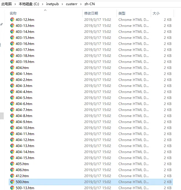 如上图所示,IIS中配置对错误的响应有三种方式,默认情况是第三个,本地访问显示详细错误信息,外部地址访问显示自定义页面,这样方便开发者调试,如果没有设置专门的错误页会使用IIS自带的样式,也就是第二张图中的配置,根据路径我们可以找到这样一个文件夹,里面都是错误提示的静态页,对应不同的状态代码
