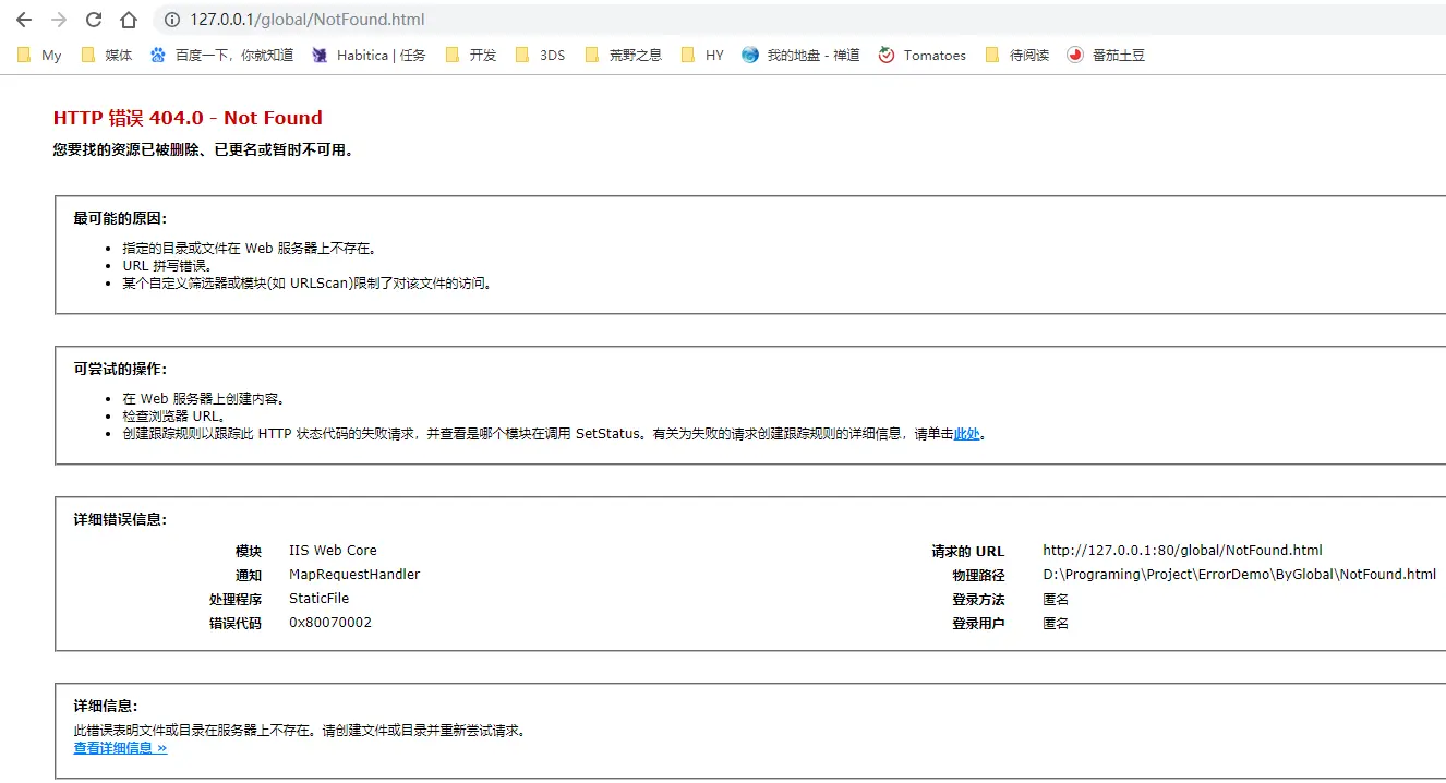 我们可以把IIS设置为均使用自定义错误页看下效果,或者直接通过文件访问