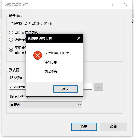 静态错误的默认页有相应的设置,看似可以修改,有“文件”、“执行URL”、“重定向”三种,但是实际设置一下就会发现报错:锁定错误