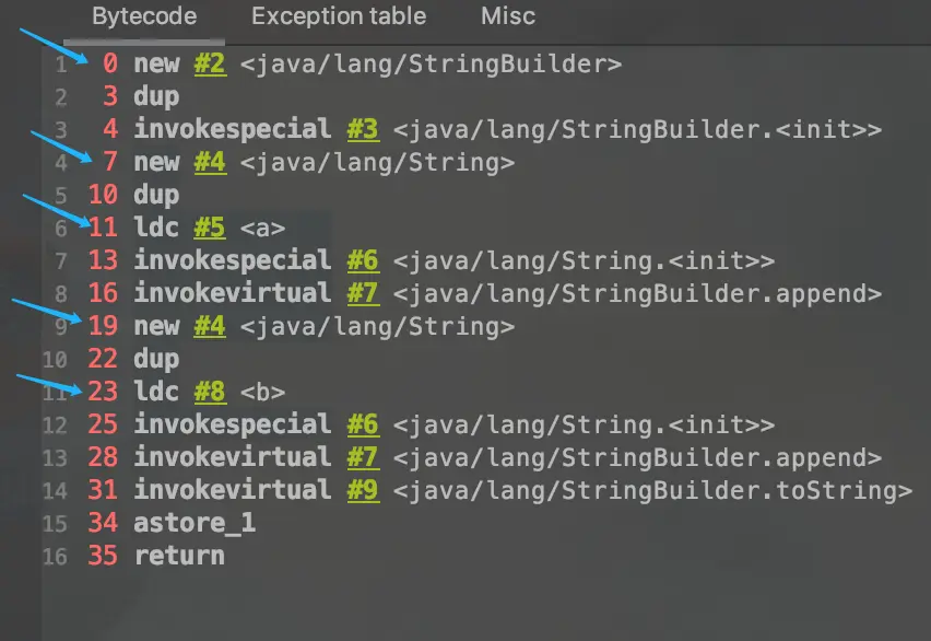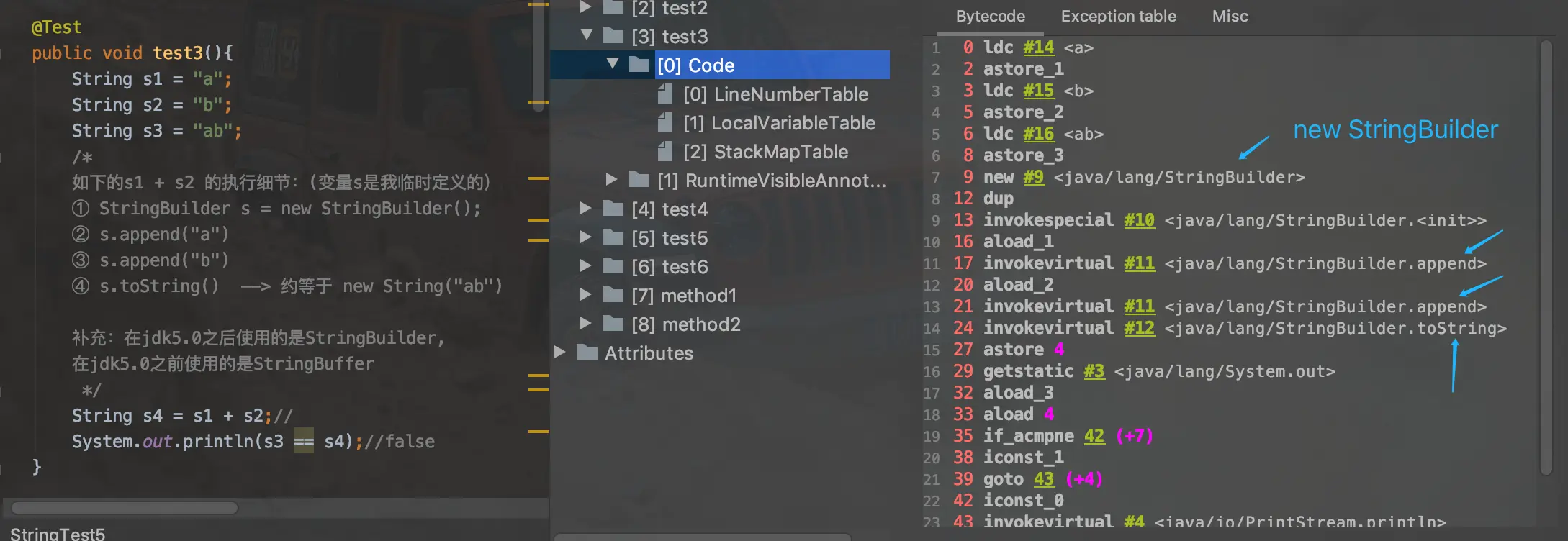 - 3.==只要其中有一个是变量,结果就在堆中==。变量拼接的原理是StringBuilder