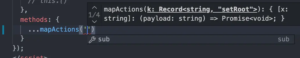 以上代码是基于lant=ts下有的提示, 但如果是在lang=js下, vetur有时能提示类型, 又是又不能提示类型,详情见issue。暂且找不到问题所在。但mapXXXX方法的提示还依然生效, 因为他不依赖vetur