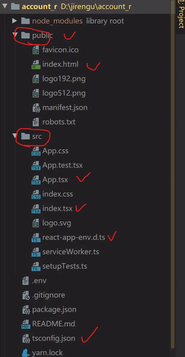 src是源代码,其中比较重要的:index.tsx 入口文件,App.tsx主组件。在index.tsx里渲染App主组件,其他组件在App里渲染。react-app-env.d.ts 用于TS的类型声明。setupTeats.ts是测试文件。