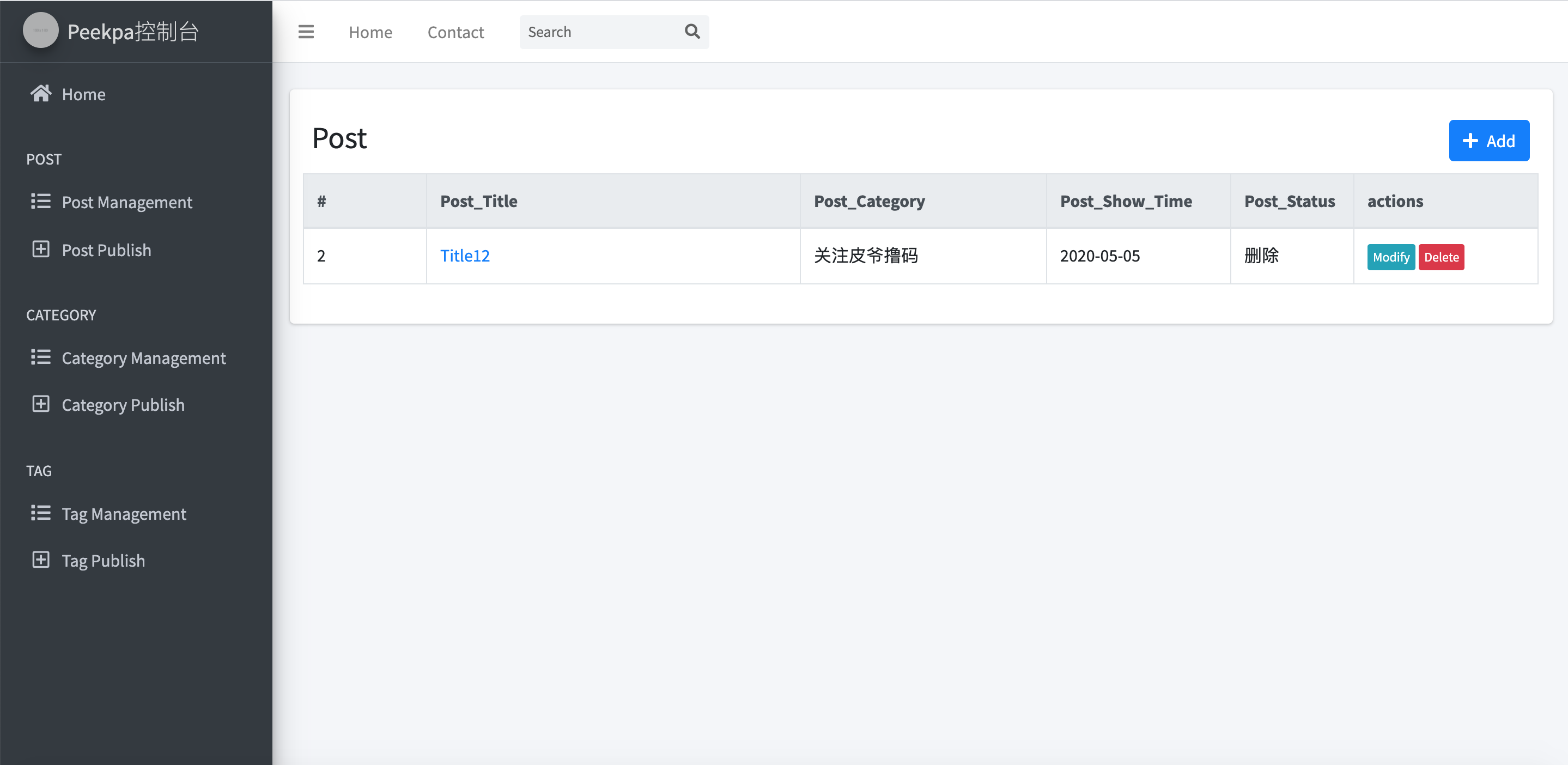 我们可以将表格的内容从原来的ID,标题,时间,操作修改为:ID,标题,分类,时间,状态,操作。