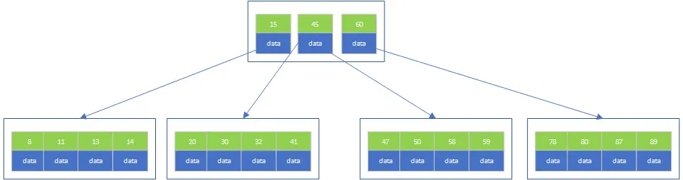 树是可以存在多叉的,即多叉树中的每个结点存在多个子结点,子结点的数据大小要保障从左到右是递增的。二叉树是搜索效率最高的,但是在数据库中并不适用二叉树,因为索引不仅存在内存中,还要写到磁盘中,为了让一个查询尽可能减少读磁盘次数,就必须让查询访问尽量少的数据块,因此使用最多的是多叉树。