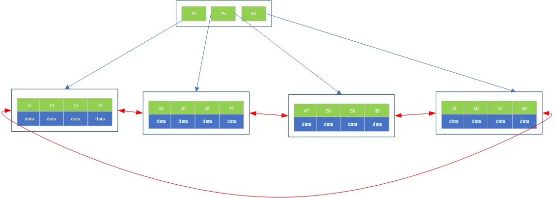 - B+树的叶子结点是由一条链来连接的,因此,当需要进行一次全部数据遍历的时候,B+树只需要耗费O(logN)的时间就可以找到最小的一个结点,然后通过链进行O(N)的顺序遍历即可。而B树则需要对树的每一层进行遍历,这会需要更多的内存置换次数,因此也就需要花费更多的时间