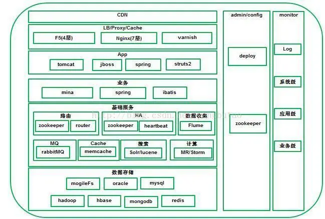 整个架构是分层的分布式的架构,纵向包括CDN,负载均衡/反向代理,web应用,业务层,基础服务层,数据存储层。水平方向包括对整个平台的配置管理部署和监控。