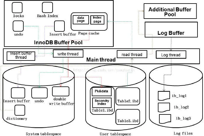 在数据结构方面,innodb包括表空间、段、区、页/块,行。索引结构是B+tree结构,包括二级索引和主键索引,二级索引的叶子节点是主键PK,根据主键索引的叶子节点指向存储的数据块。这种B+树存储结构可以更好的满足随机查询操作IO要求,分为数据页和二级索引页,修改二级索引页面涉及到随机操作,为了提高写入时的性能,采用insert buffer做顺序的写入,再由后台线程以一定频率将多个插入合并到二级索引页面。为了保证数据库的一致性(内存和硬盘数据文件),以及缩短实例恢复的时间,关系型数据库还有一个checkpoint的功能,用于把内存buffer中之前的脏页按照比例(老的LSN)写入磁盘,这样redolog文件的LSN以前的日志就可以被覆盖了,进行循环使用;在失效恢复时,只需要从日志中LSN点进行恢复即可。