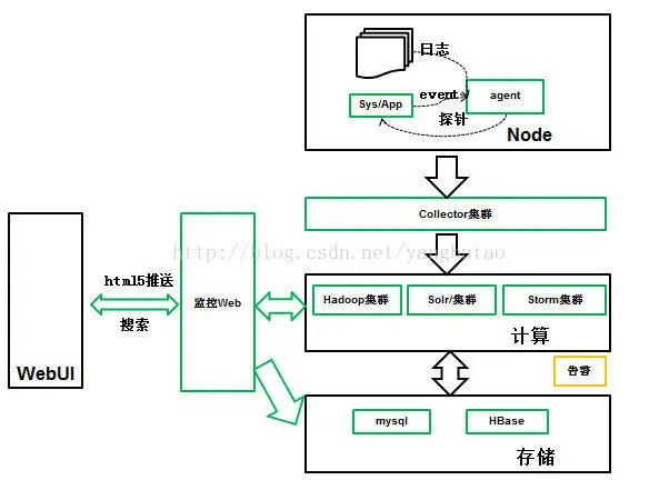 数据统一通过collector集群进行收集,按照数据的不同类型分发到不同的计算集群进行处理;有些数据时效性不是那么高,比如按小时进行统计,放入hadoop集群;有些数据是请求流转的跟踪数据,需要可以查询的,那么就可以放入solr集群进行索引;有些数据需要进行实时计算的进而告警的,需要放到storm集群中进行处理。
