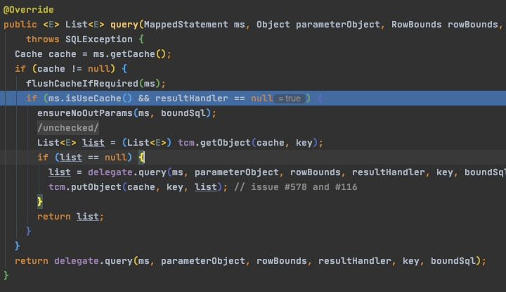 debug可以看到,调用会进入到cacheExecutor里的query方法,其实chacheExecutor是baseExecutor的包装类,这里面会先判断缓存中存不存在,这里可以看到获取缓存的方法是从ms.getCache()中获取的,MappedStatement这个类实际上是封装在Configuration里面的,是在加载配置文件生成配置类的时候就已经创建了的,通过修改配置文件开启二级缓存,会把不同sqlSession会话中的结果信息和方法信息都缓存在MappedStatement的实例变量Map中,用以其他会话的查询。