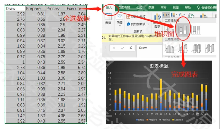 这里我们可以整理一下datas.csv中的Draw、Prepare、Process、Execute信息。 我们使用Excel来整理,操作如下图: