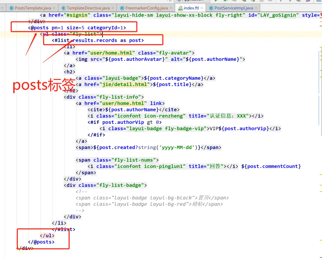 好了,freemarker 标签就是这样生成了,下面我们在页面中使用。我们定义的标签名称是 posts,结果是 results。所以置顶模块,我们这样写: