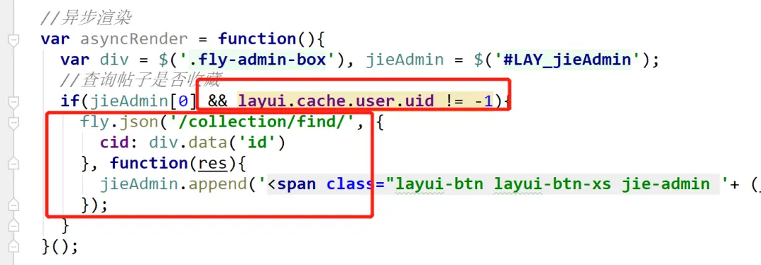 LAY_jieAdmin 是为了限定只有文章详情页才加载这个 js,而其他页面不需要;那 layui.cache.user.uid 是哪里设置的呢?大家还记得我们一开始给 html 分模块的时候吗,我们在 layout.ftl 宏中有一段 js,原本 uid 的值就是 - 1,所以我们需要把登录之后的值附上去。