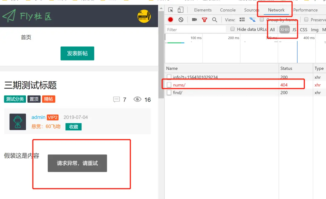 到了这时候,你发现,刷新页面之后,还是有弹窗提示,这是啥问题?浏览器打开 F12,切换到 Network 标签,因为我们猜想应该是一些异步请求出了异常,所以触发了弹窗提示。接下来我们就要找到这个请求,Network 下,我们再点击 XHR,因为这表示是发起的异步请求的链接。从这里我们就看到了一个 nums / 的请求是 404,具体的请求其实是:http://localhost:8080/message/nums/,