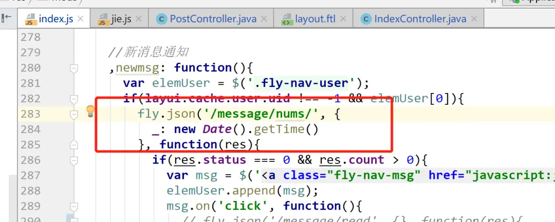 然后我们再全局搜索 / message/nums 找到发起这个异步请求的 js 地方:
