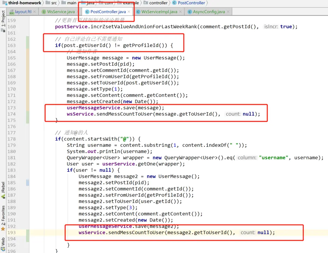 所以使用了 @EnableAsync 注解之后我们就可以使用 @Aysnc 注解来实现异步了,asyncTaskExecutor() 其实就是我用来重写 AsyncTaskExecutor 用的,定义了最大线程组等信息。另外 Async 其实还可以配置很多信息,比如异步线程出错时候的处理(重试等),大家课后可以多查询一下资料,这注解我在工作中运用其实还比较多的。 好了,上面我们已经把发送 ws 消息的方法改成了异步方法,会起一个线程执行发送。我们现在需要调用的地方其实就是在评论那里。