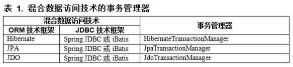 如果你采用了一个高端ORM技术(Hibernate,JPA,JDO),同时采用一个JDBC技术(Spring JDBC,iBatis),由于前者的会话(Session)是对后者连接(Connection)的封装,Spring会“足够智能地”在同一个事务线程让前者的会话封装后者的连接。所以,我们只要直接采用前者的事务管理器就可以了。下表给出了混合数据访问技术所对应的事务管理器: