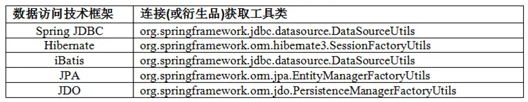 Spring为每个数据访问技术框架都提供了一个获取事务上下文绑定的数据连接(或其衍生品)的工具类和数据源(或其衍生品)的代理类。