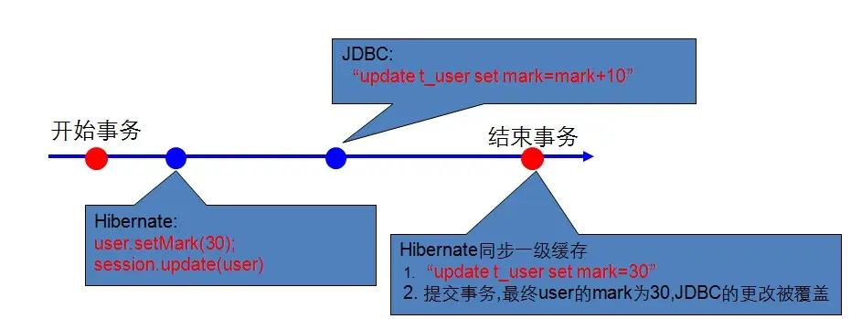 正是因为以上原因的存在,所有在混合使用JDBC和Hibernate时,可能存在丢失更新的问题。