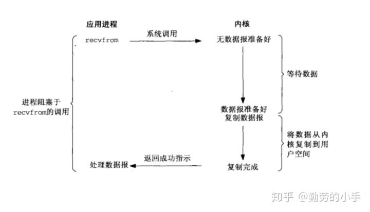 描述:应用A调用recvfrom读取数据时,在数据被复制到应用缓冲区或发送错误时才返回,在此期间一直等待,进程从调用到返回这段时间内都被阻塞。