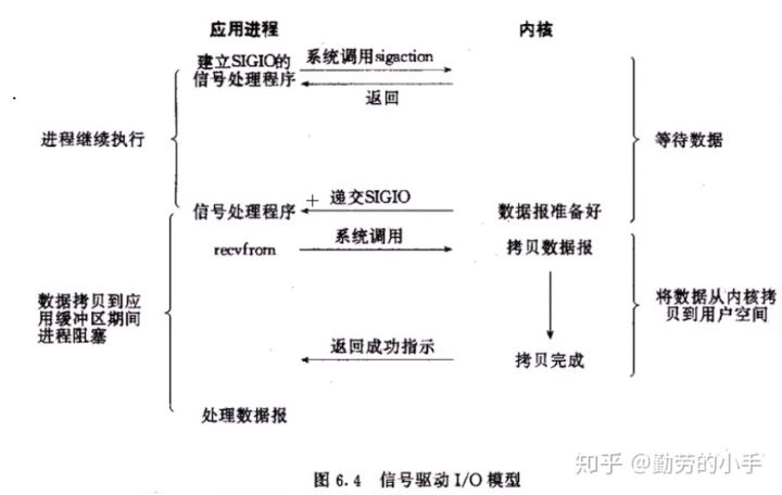 不用轮询监控,而是在调用sigaction时候建立sigio的信号联系,当内核数据准备好之后再通经过SIGIO信号通知线程数据准备好的状态。线程收到信号后再向内核发起recvfrom读取请求。因为信号驱动IO模型下应用多线程在发出信号监控后即可返回,不会阻塞。