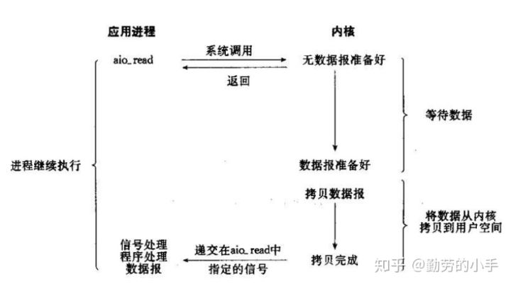 问题:之前无论IO复用或信号驱动IO,都需要先select询问状态,再 recvfrom获取数据。能不能直接通知内核我要数据,剩下的交给你? 解决:应用告知内核启动某个操作,让内核在整个操作完成后,通知应用,这种模型与信号驱动模型的主要区别是,信号驱动IO是内核告知可开始下一个IO操作,而异步IO模型是由内核告知操作完成。