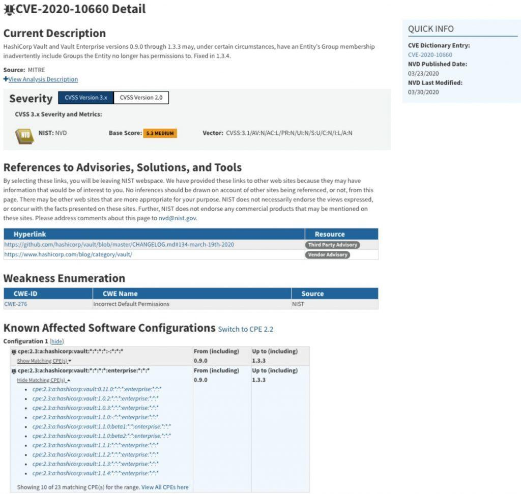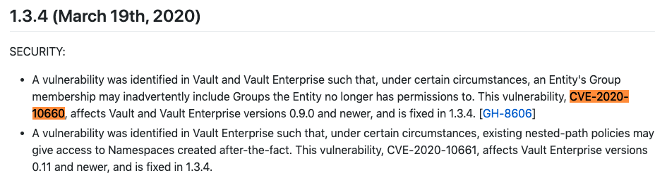 gopkg.in/hashicorp/vault.v0和github.com/hashicorp/vault都受到了HashiCorp Vault和Vault Enterprise0.9.0到1.3.3版本中的CVE-2020-10660的影响。在使用这些Package时,在某些情况下,它们可能使实体的组成员无意间包含了该实体不再具有权限的组。Vault Enterprise中发现的另一个漏洞是,在某些情况下,现有的嵌套路径策略可能会提供对事后创建的命名空间的访问权限。幸运的是,在版本1.3.4中对这些漏洞进行了修复。