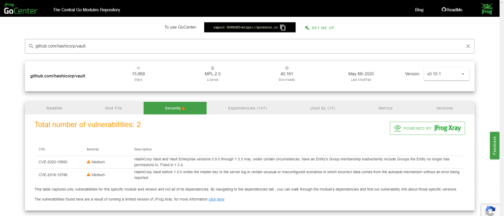 一旦确定了所有组件和依赖项,它们的信息就会与其他漏洞源和数据库进行交叉引用,以提醒您任何潜在的威胁。GoCenter上提供了免费的针对Go Module的基本Xray漏洞扫描,如“安全性”选项卡所示: