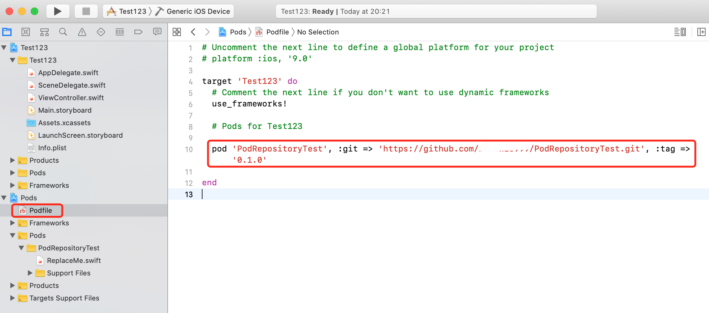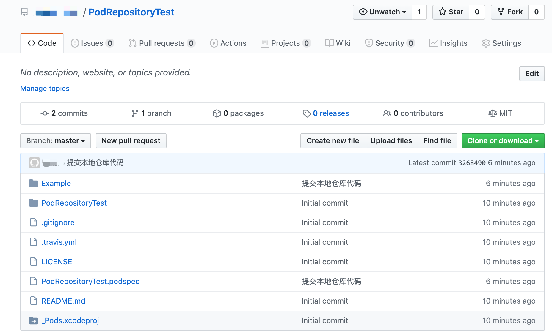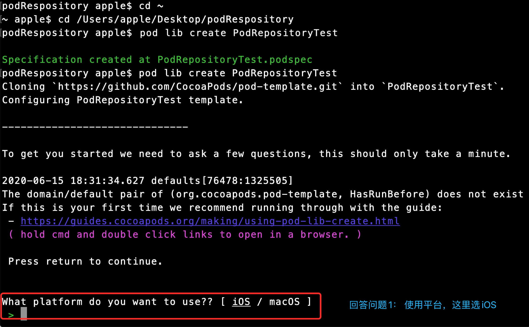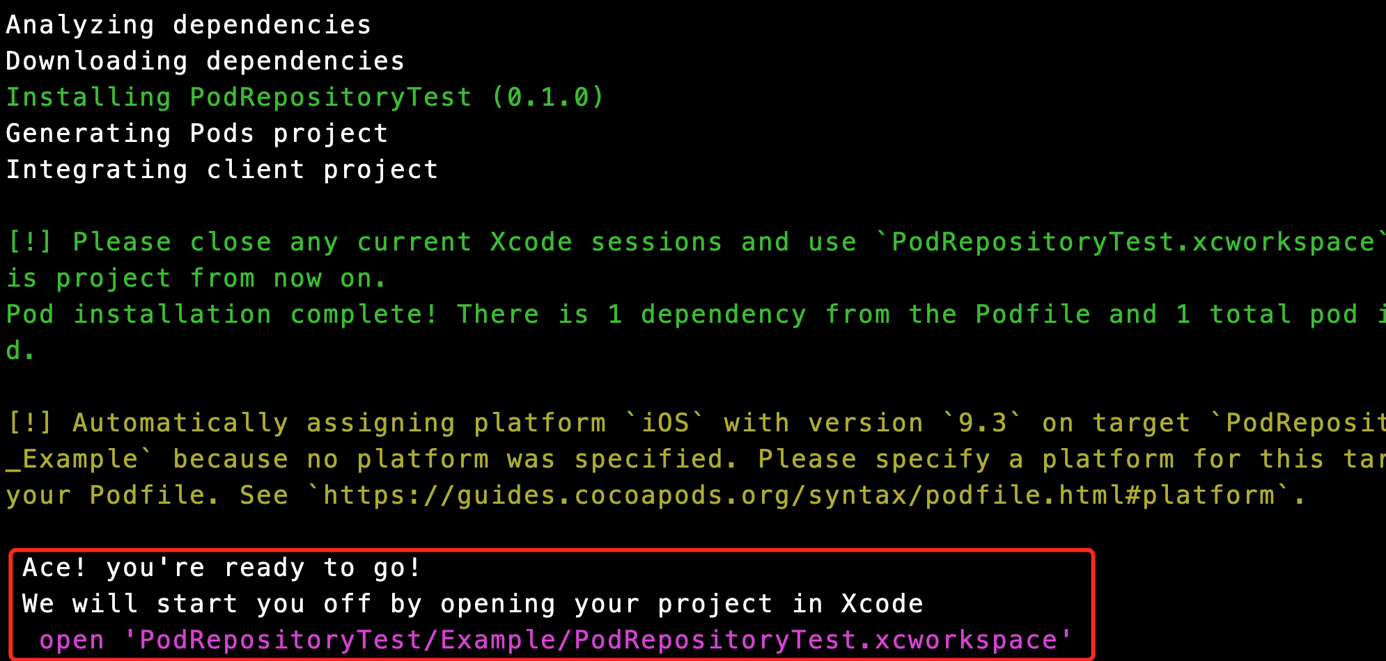 回答完问题,会自动创建本地仓库,创建完成Xcode会自动打开PodRepositoryTest.podspec工程