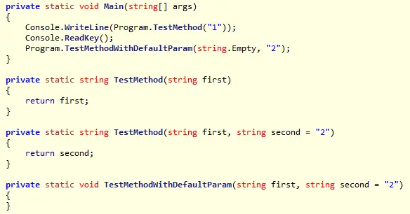 private static void TestMethodWithDefaultParam(string first, string second = "2")