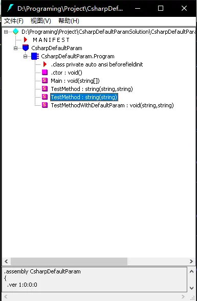 通过ILSpy我们简单的看到调用时两个方法的区别,但是默认参数的实现情况我们还不是很清楚,所以可以再通过VisualStudio自带的IL反汇编程序ildasm看一下,使用VS的命令行工具输入 ildasm 打开程序,然后打开我们的控制台程序的exe文件