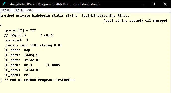 这时我们打开有默认参数的方法,可以看到在IL的形式下,默认参数前面有个[opt]的标识,代表着Optional,即“可选的”,这是C#的一个特性标签——OptionalAttribute,通过OptionalAttribute和DefaultParameterValueAttribute这两个特性也就实现了C#的默认参数,这方面已经有相关的博文,可以参考谈谈C# 4.0新特性“缺省参数”的实现