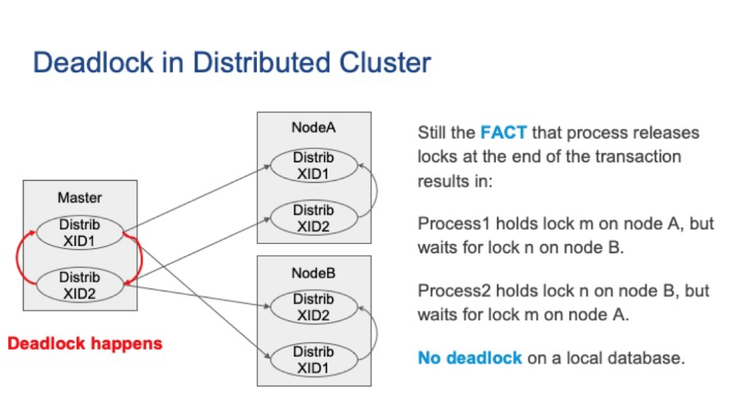 请注意,节点A或节点B上都没有死锁,但是死锁确实出现了。从主节点的角度来看,这就是所谓的全局死锁。
