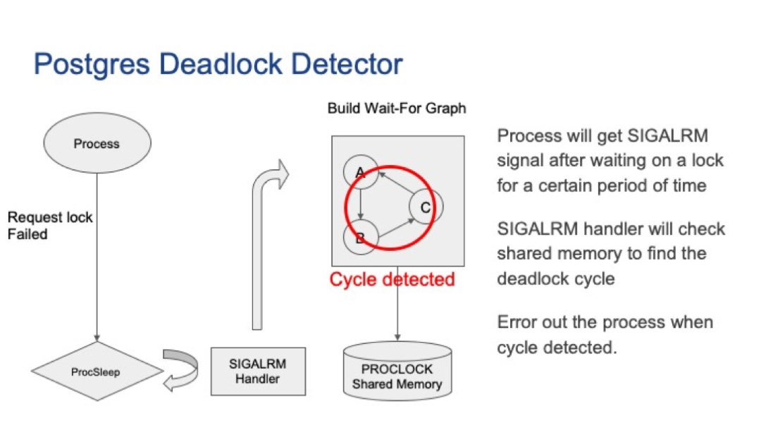 SIGALARM处理程序将检查PROCLOCK共享内存以构建等待图。以当前进程为起点,检查是否存在环。环意味着发生死锁。当前进程会主动退出以打破死锁。Postgres死锁检测器可以处理本地死锁问题。