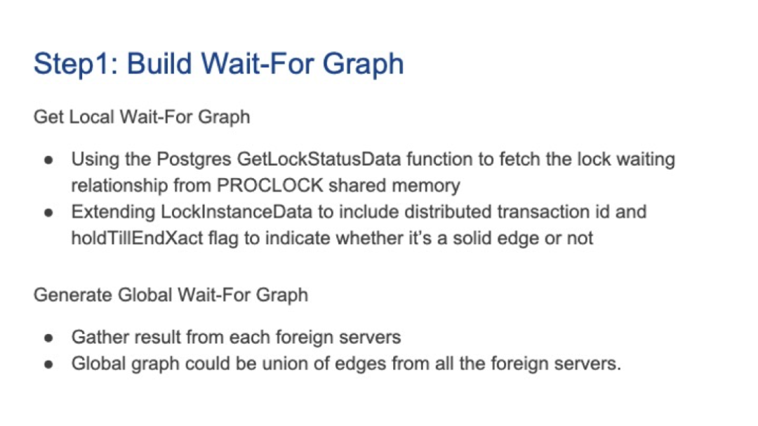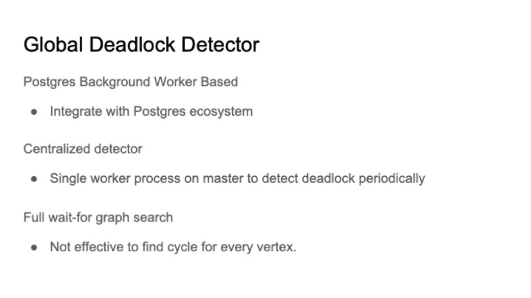 **在本演讲中,我们将提出一个关于如何在Postgres fdw集群中实现全局死锁检测器的想法。**但是这个概念很普遍,可以作为对其他Postgres集群实现的参考。实际上,我们参考了Greenplum全局死锁检测器的实现。首先,将全局死锁检测器实现为Postgres的Background Worker,使其更兼容Postgres,高可用等需求都可以通过Postgres的Background Worker来实现。其次,我们提出使用集中式检测算法,这意味着我们只需要在主节点上启动一个工作进程来收集事务等待关系并定期检测死锁。请注意,在Postgres的本地死锁检测器中,Postgres后端进程以自己为起点检测死锁。由于我们使用全局检测器,因此必须执行完整的等待图搜索以检测死锁。这需要一种更好的算法来检测死锁,因为Postgres的基于每个顶点的查找环算法并不高效。