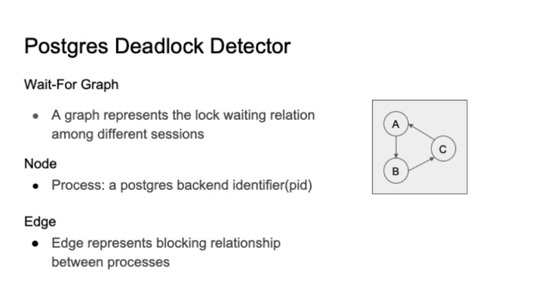 Postgres使用死锁检测器来处理死锁问题。死锁检测器负责检测死锁并打破死锁。检测器使用等待图(wait-for graph)来为不同后端进程之间的等待关系建模。图的节点由进程标识符pid标识。节点A到节点B的边表示节点A正在等待由节点B持有的锁。