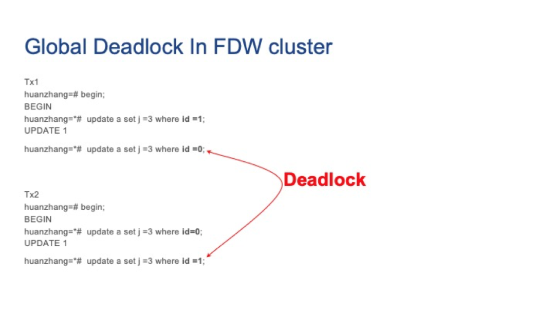 接着,我们在两个并发会话上运行以下更新查询,我们可以看到两个会话都由于死锁而挂起。但是每个外部服务器上的本地Postgres死锁检测器却无法检测到它们。